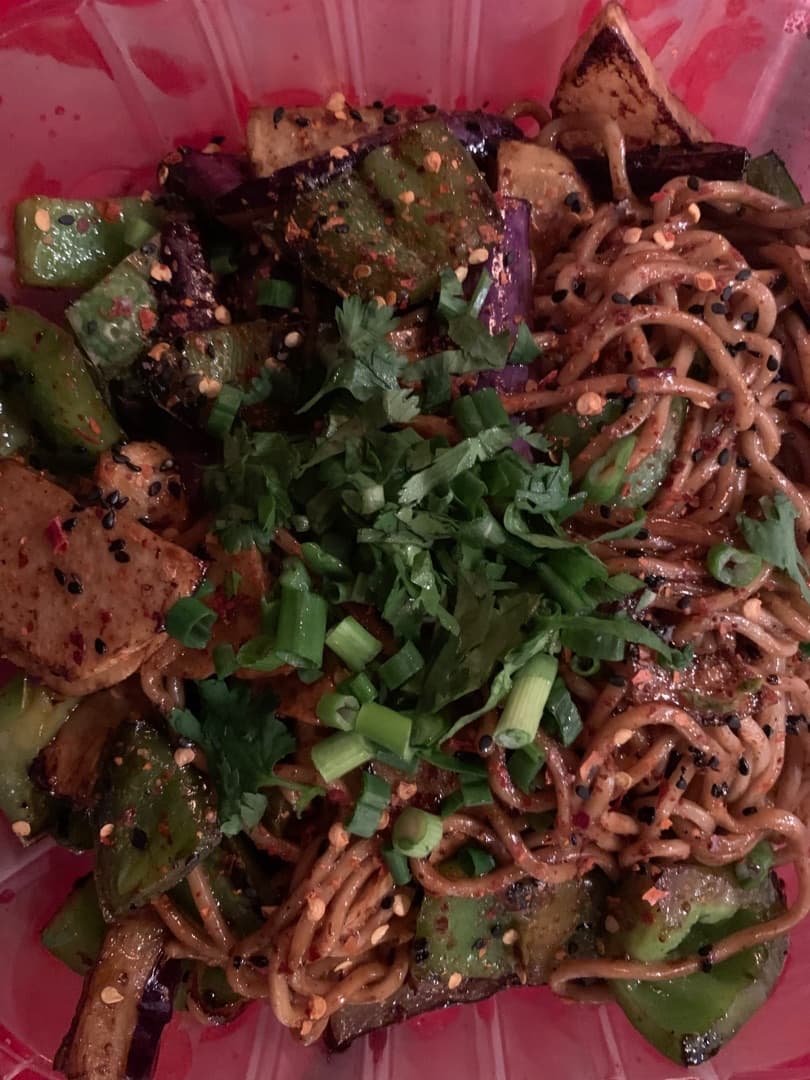 This place has a few vegan options. I didn’t like the fact that they serve the food in plastic containers even if you consume it there. It is a nice place with a nice environment located in deep Ellum. The noodles taste pretty good and they came with green pepper, potatoes, and eggplant