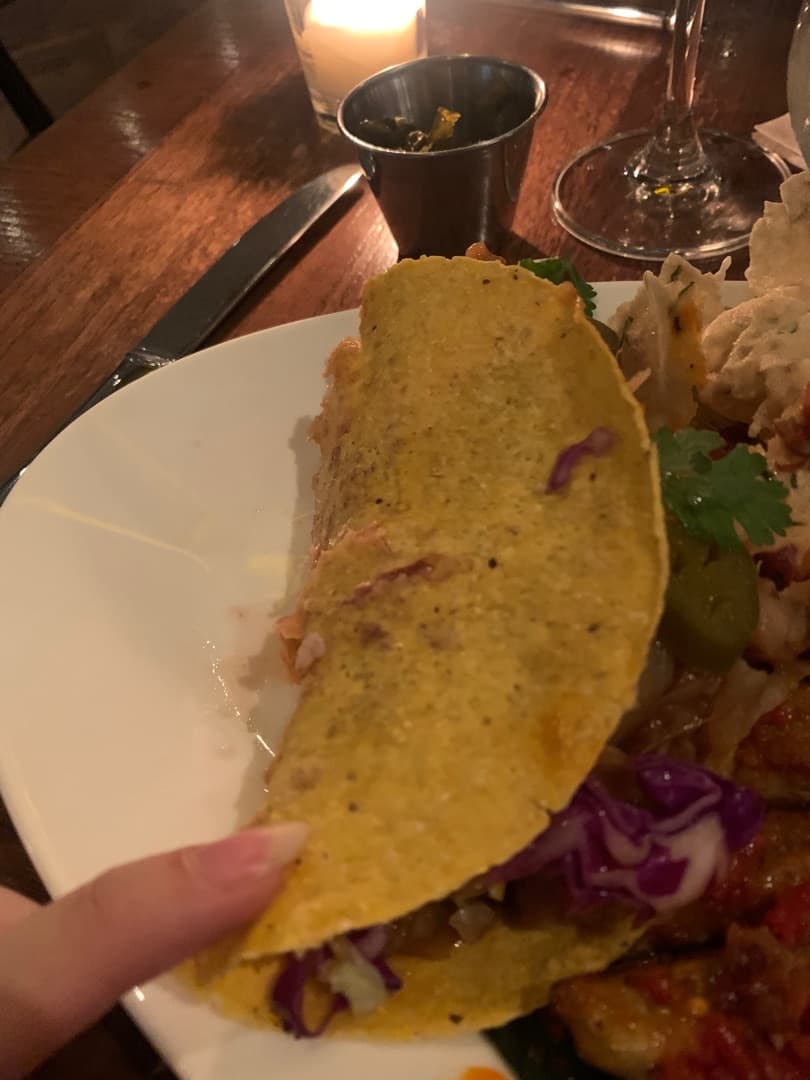 It’s served as three tacos filled with jackfruit. It’s a very strong flavour coating the jackfruit (a mixture of bbq sauce / liquid smoke perhaps) which I found a bit too intense.
