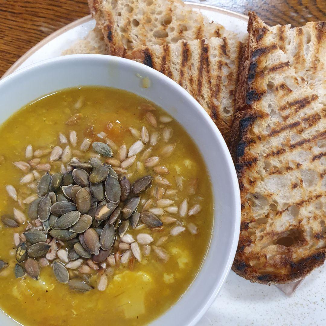 Comes with sour dough toast and a good sprinkling of pumpkin and sunflower seeds. Great taste and really filling.