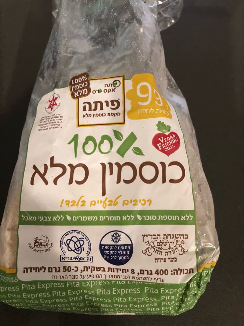 פיתה מעולה מקמח כוסמין מלא. קבוע אצלנו בבית. חבילה של פיתות קטנות וטעימות להפליא.