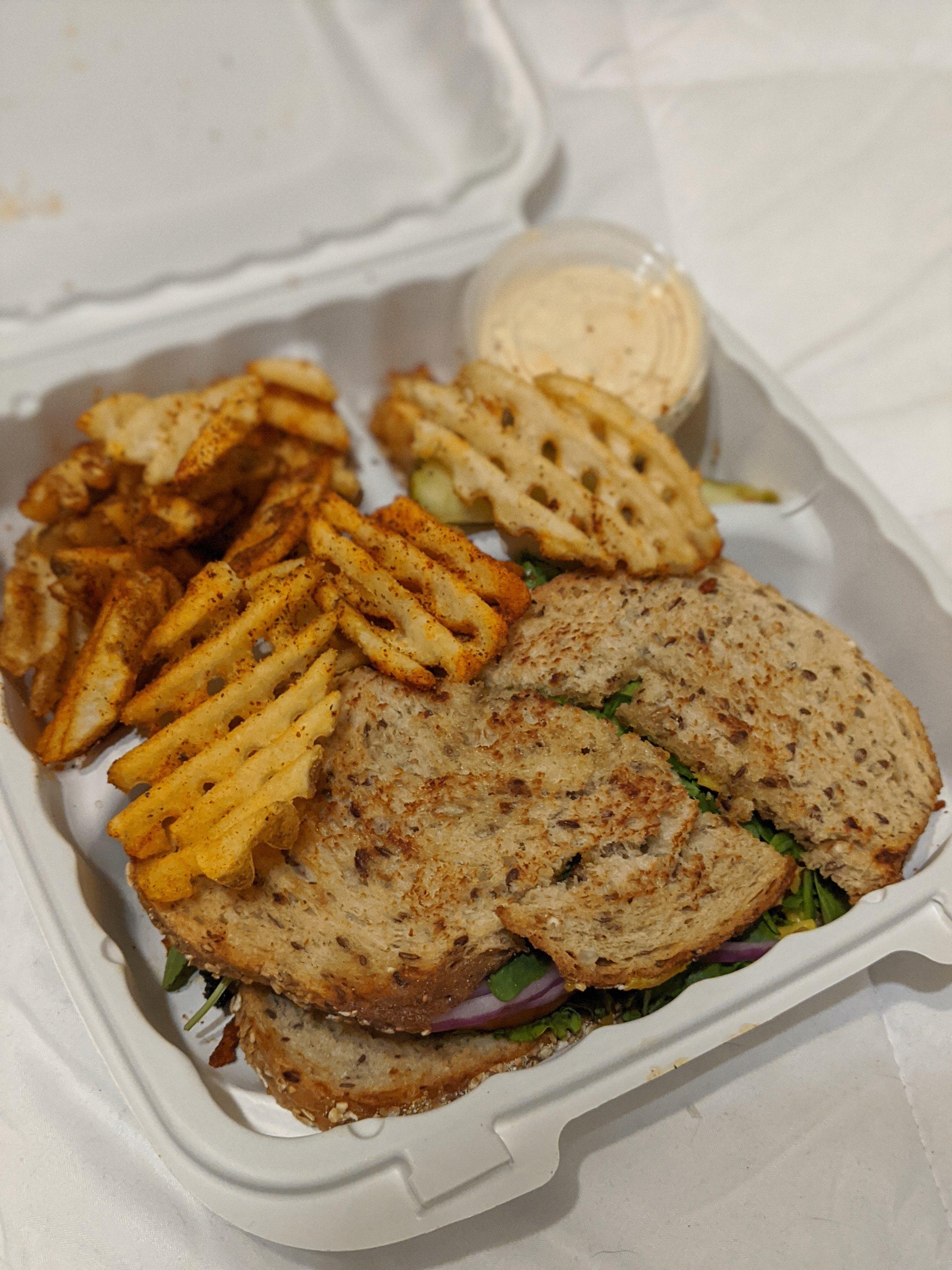 This is my favorite sandwich at Chicago Diner! I love how simple it is, yet has so many flavors!! Vegan cheese, tasty mayo, tomato, lettuce, onion, sprouts, and avocado!! Perfect with waffle fries! Ask for extra sauce on the side for dipping! #mercyforanimals