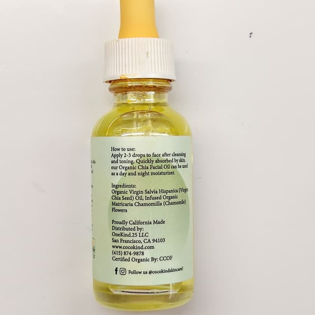 Aceite hidratante elaborado con chía y manzanilla orgánicas certificadas. Viene con un gotero para aplicar de a 2-3 gotas y es de rápida absorción.