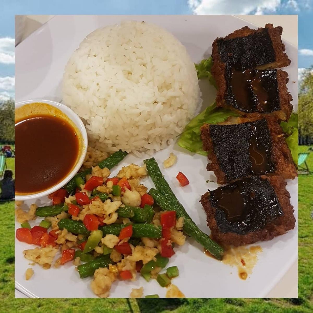 This dish resembles Japanese Unagi Bento... Only It's vegan! Rice that comes with vegan Unagi which is really flavourful and amazing in texture, side of sauteed spicy green beans and soy protein, and a spicy-sweet-savoury sauce. It comes with a bowl of tofu soup as a side too!