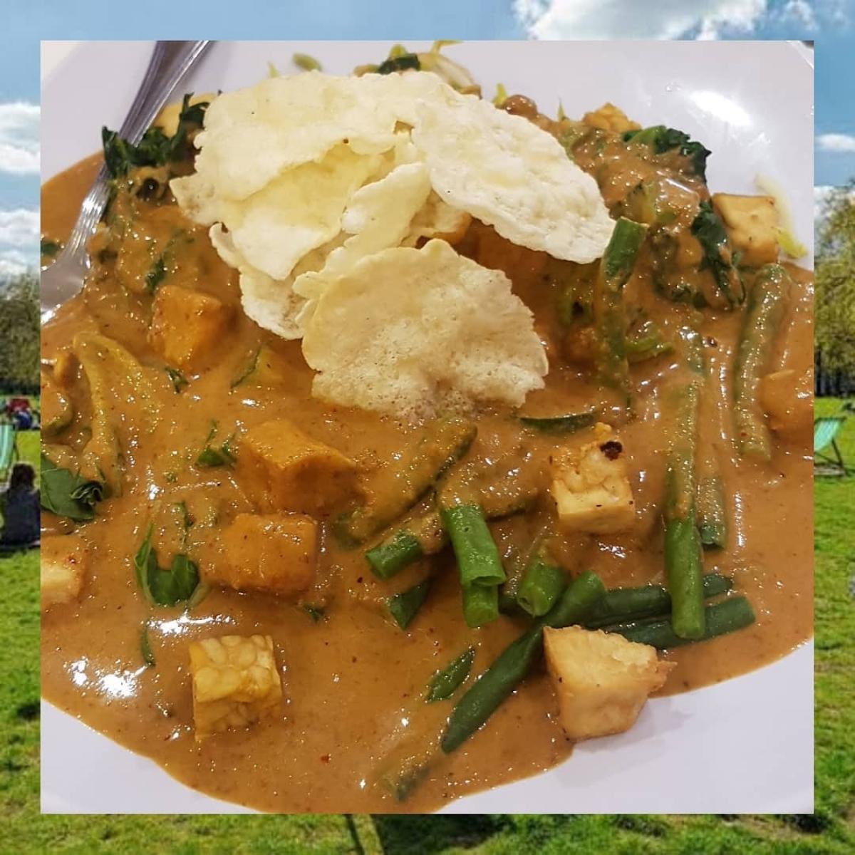 The Pecel from Loving Kitchen is SO GOOD. It has leavy greens and green beans which are boiled or steamed til soft, many pieces of tofu and tempe which are fried lightly til golden brown, fenerous amount of Javanese peanut sauce, topped with some chips. The sauce is both sweet and savoury, very peanutty, and it makes the meal very high in protein. #jaan