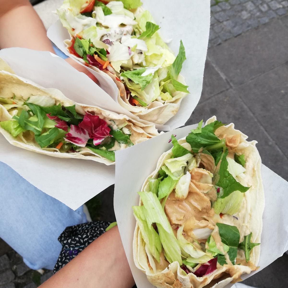 Mein Dad hat mir Vegi empfohlen, dort hat er anscheinend sein erstes und bestes Falafel gegessen (bedeutet das ist schon sehr lange her). Geschmeckt hat der Wrap wirklich super gut, der Salat war mega frisch und es gab ein paar leckere Saucen zum auswählen. (Eigentlich ist es ja kein Wrap, aber so steht es auf der Tafel vor dem kleinen Imbiss.) Meiner war mit Humus und Erdnuss-Creme, sehr zu empfehlen. Meine Freundin, die keine Falafel-Bällchen mag, hat gratis einen falafellosen Wrap mit extra viel Sauce(links) bekommen.