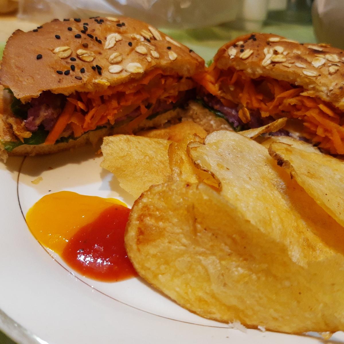 Hamburguesa de camote y tinga de zanahoria acompañada de chips
