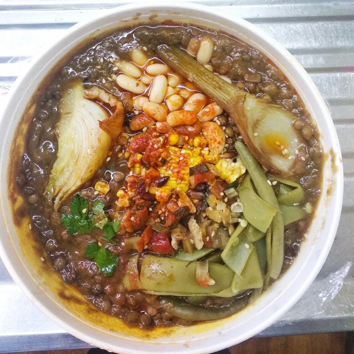 Este guiso de lentejas es de lo más delicioso que probé, me comería mil. Contiene lentejas, chaucha, choclo, porotos blancos, hinojo y condimentos.