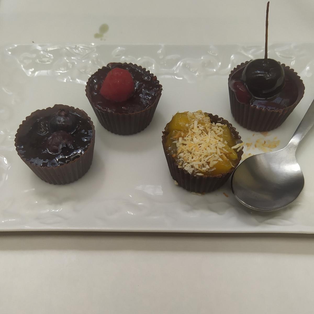 Son canastitas de chocolate negro con mermelada de diferentes frutas: albaricoque, cereza, frambuesa y arándanos. Muy buenas.