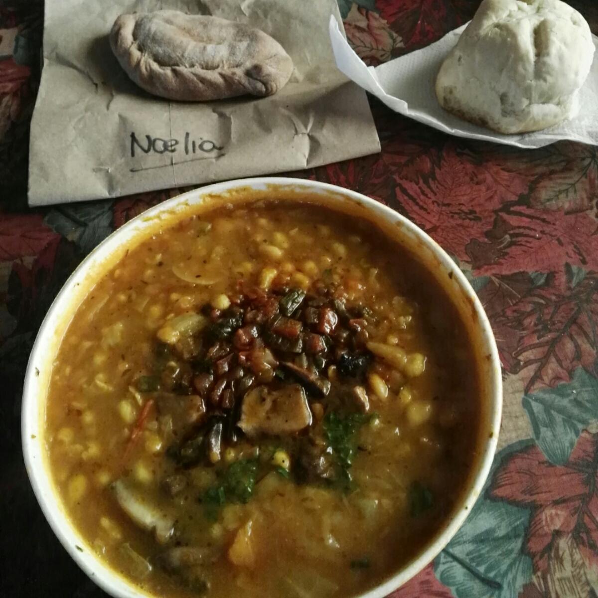 Locro con champiñones y hongos de pino, acompañado con una empanada criolla de lentejas muchos sabores abundante, accesible el precio!