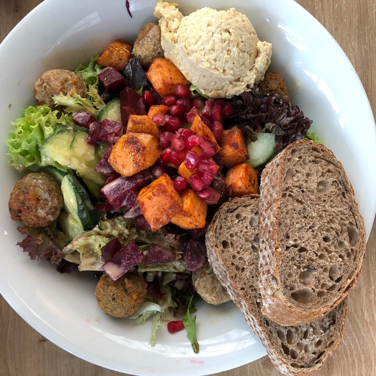 Unglaublich leckerer Salat mit Falafel, Humus, Süßkartoffel, Granatapfelkernen und herrlichem Dressing