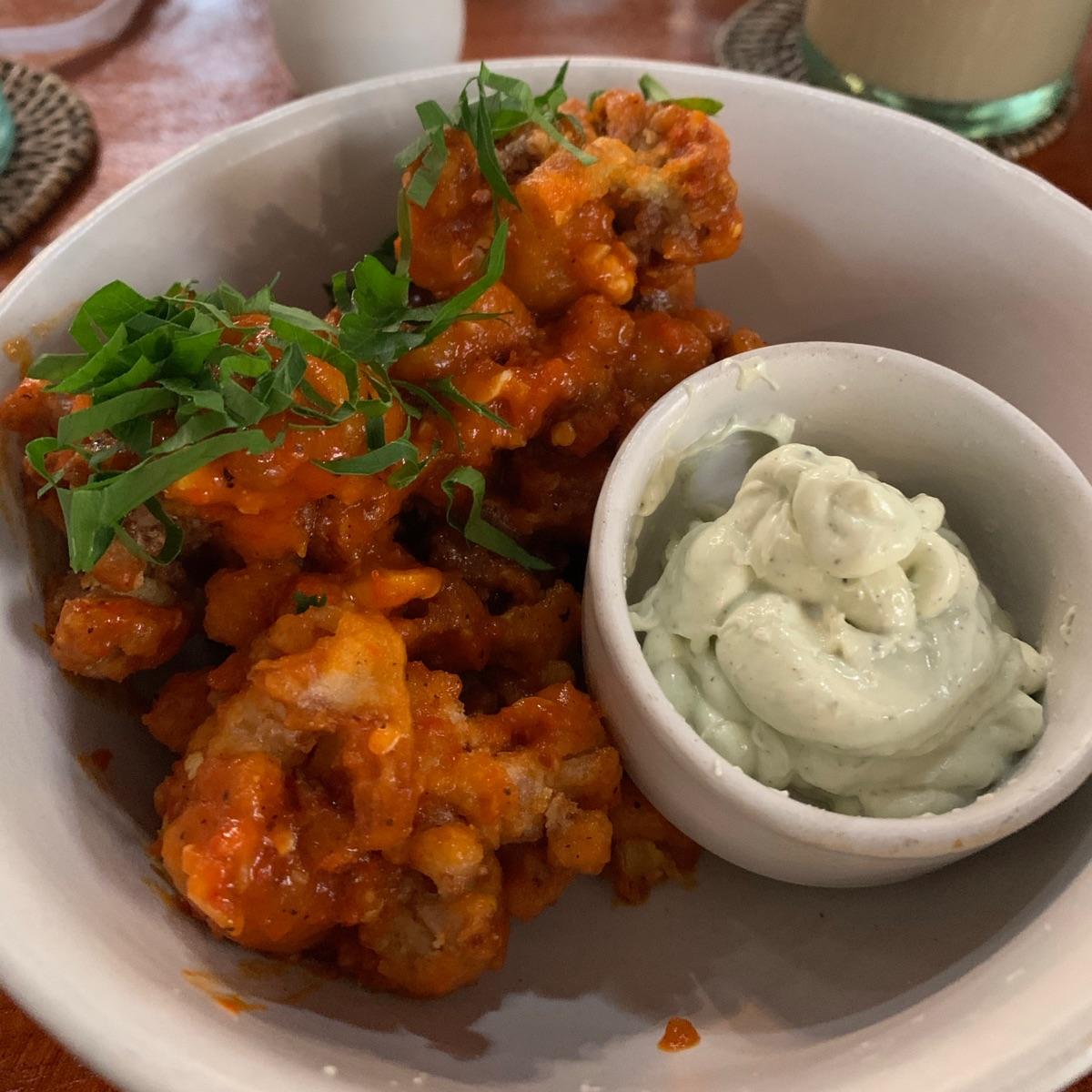 Best cauliflower wings I've had. Really well seasoned and just the right spice level. The 'mayo' on the side is fantastic as well.