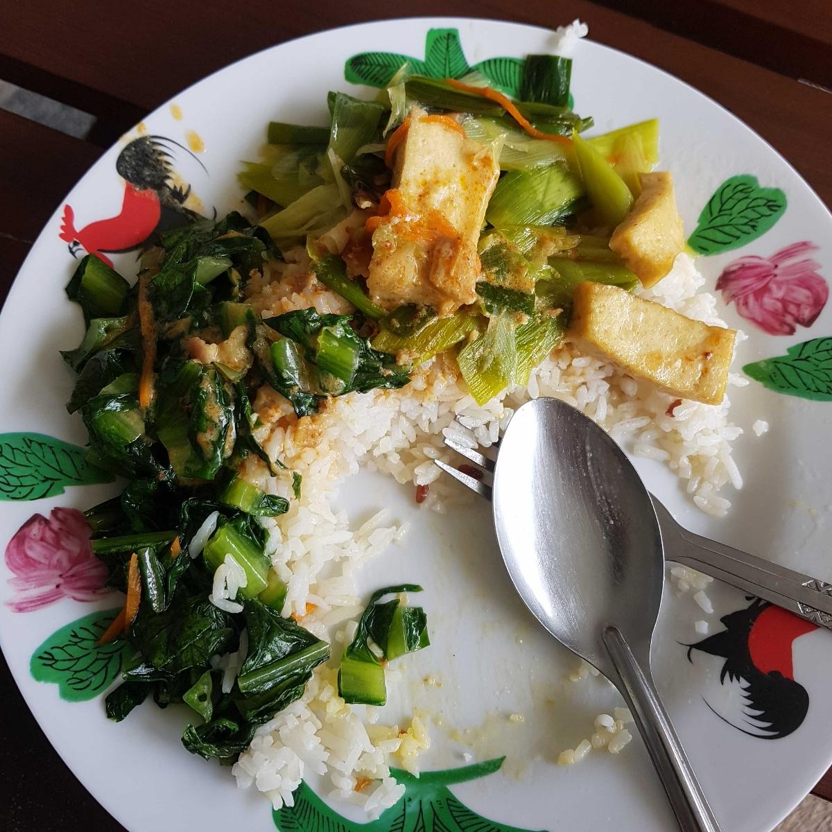 Excuse the half eaten food... i ate my egg first so the rest would be vegan🤣🤣 just wanna hit the highest number of reviews so i can donate more 👍 anyway this, including the egg was $2 (SO WORTH), and the veg was cooked nicely, leek was soft and complemented the tofu so well, and rice was soft and really tasty with curry sauce as well! One of the last few meals i will be eating in this canteen as im a j2 :-(