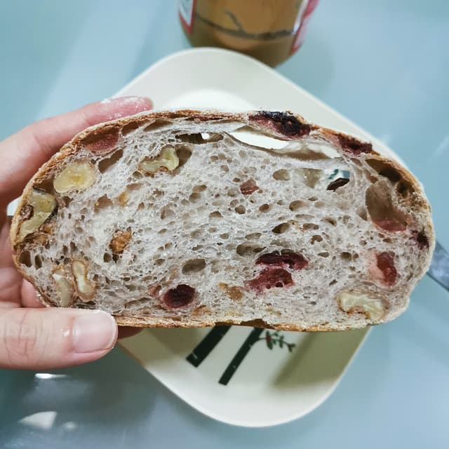 The bread is rich of Cranberries and walnuts. Best served after toast.