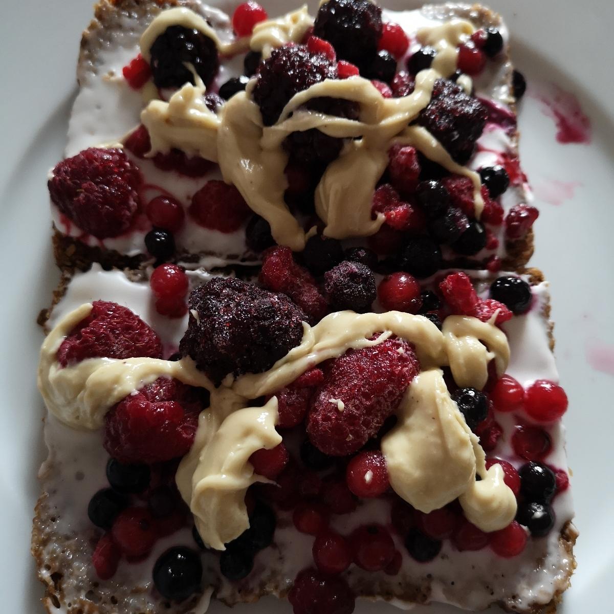 Made this tasty treat today on Rye bread, vegan cream cheese, frozen berries and Cashew Butter