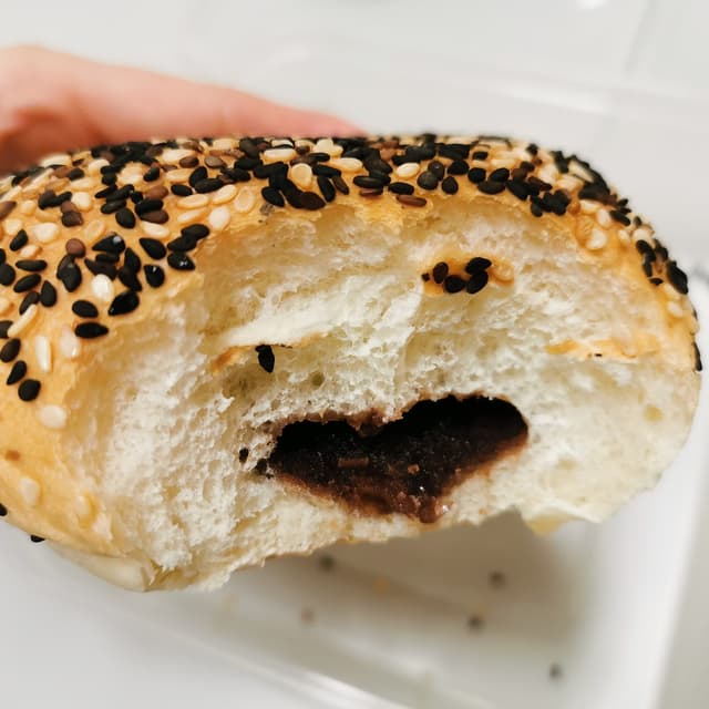 The white and black sesame cover the top of the bun and red bean paste filled inside. Taste great. I would prefer if nuts, walnuts maybe added as fillings will give a crunchy bite.
