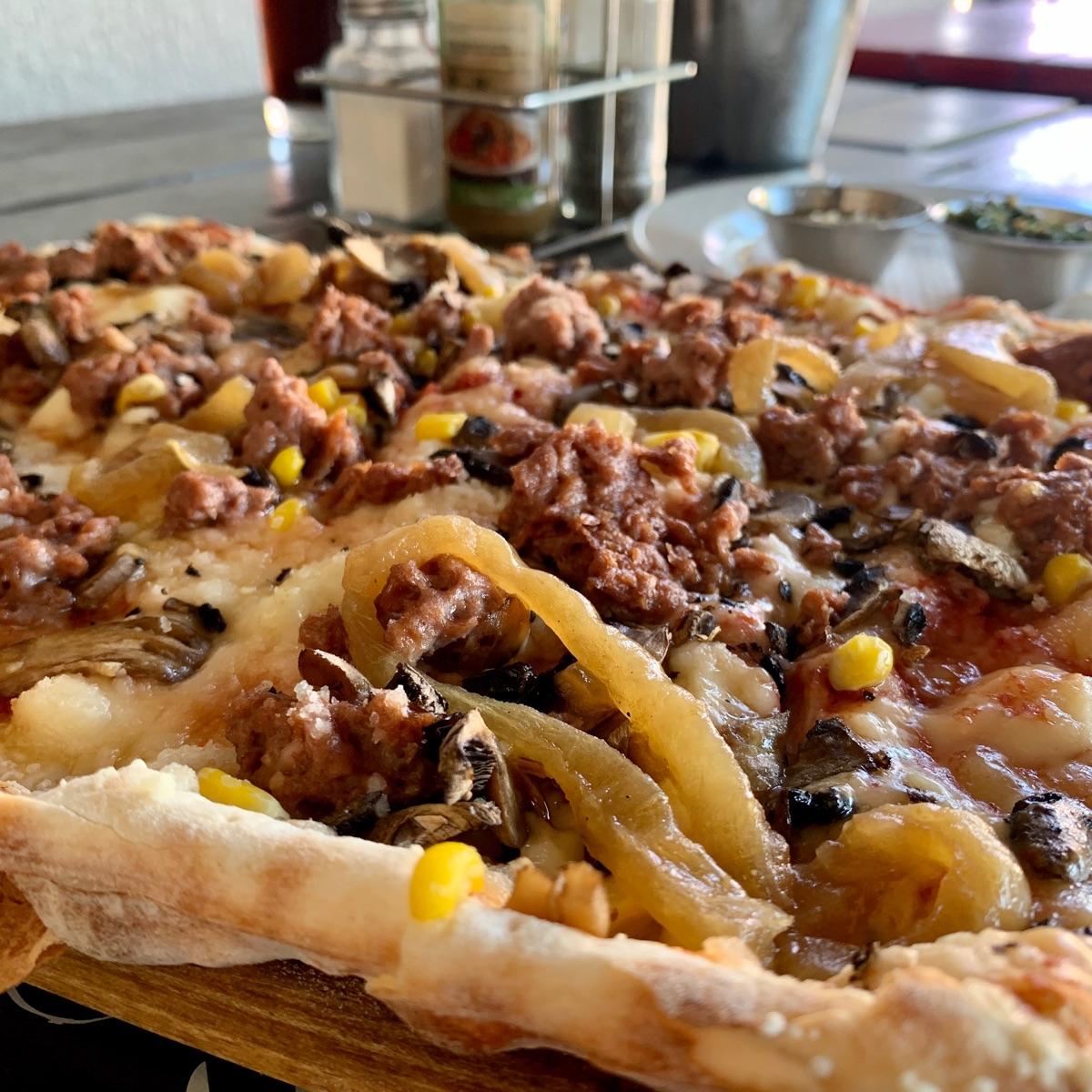 Beyond Meat mince, mushrooms, roasted corn, glazed onion and vegan mozzarella. This is one really tasty pizza! A bit on the pricey side but worth it in my opinion.