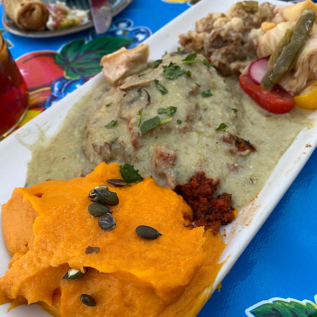 this was incredible! Nothing I didn’t like. Mushroom with chorizo and a crema on top, nopalito/artichoke heart salad (SO good), sweet potato purée, tamale stuffing !!!