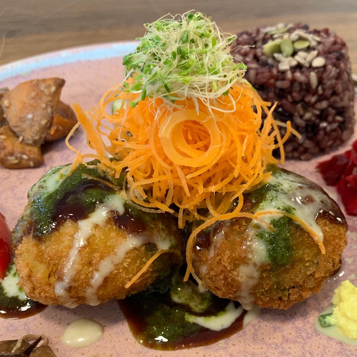 Crunchy potato kidney bean chickpea croquettes topped with coriander and green curry mayo delicious #veganin2020