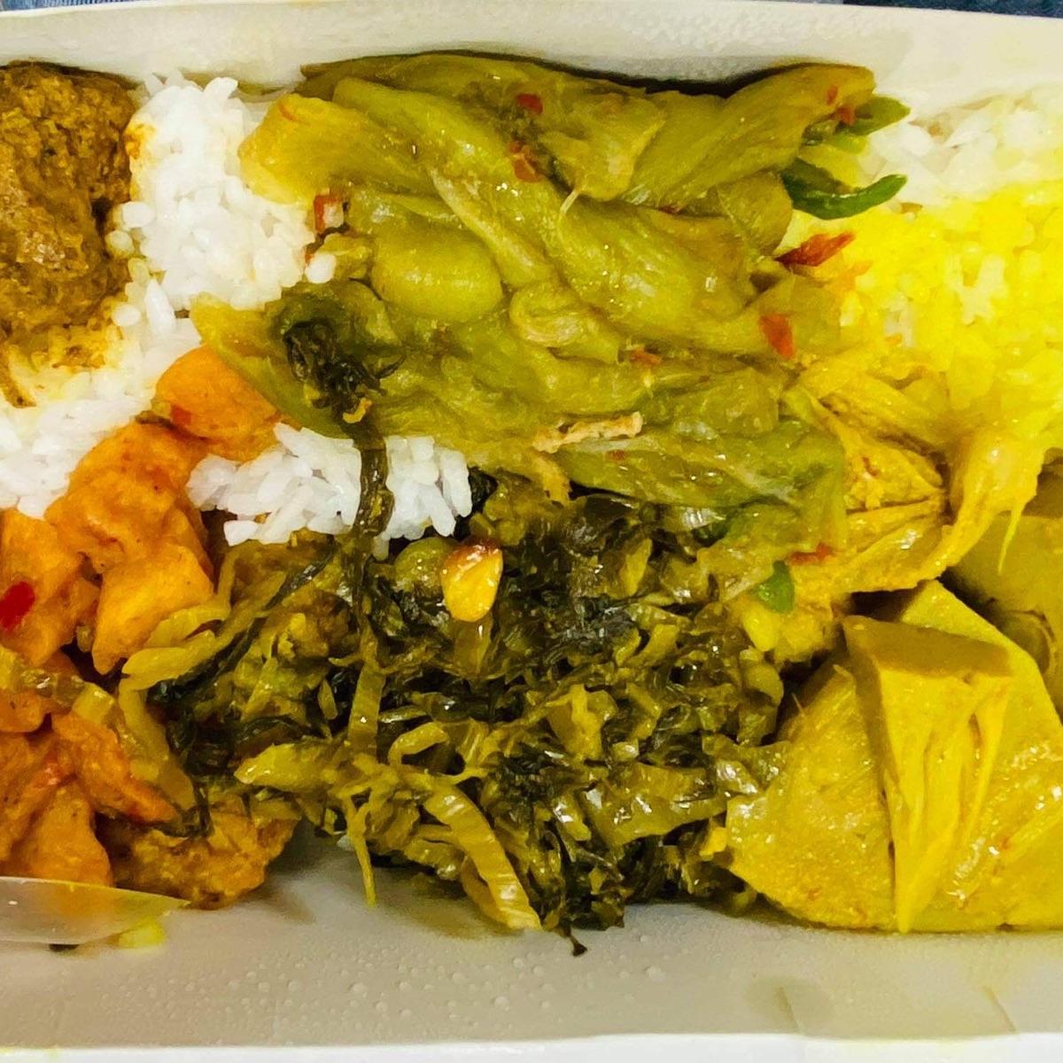 Vegan buffet present in Kalimantan cuisine with jackfruit curry, chillin potato, and rice.