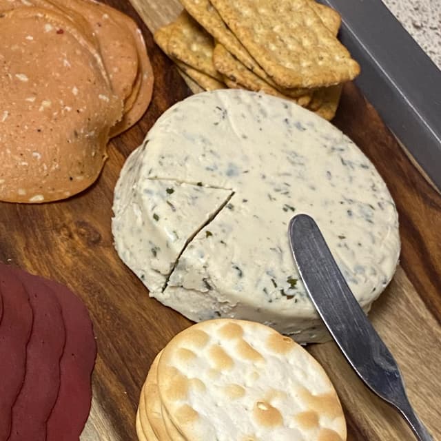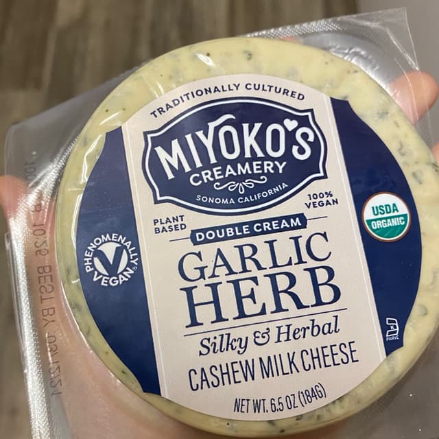Introducing our new Double Cream Garlic Herb Cashew Milk Cheese. Made from the finest cashews, this vegan cheese offers a rich and creamy texture with a burst of garlic and herb flavors. It's a great addition to your next charcuterie board or sandwich. Say goodbye to dairy and experience a healthier, plant-based alternative that will satisfy your cravings. Based on reviews, this cheese is a hit among vegan and non-vegan cheese lovers alike. Try it today and see for yourself!