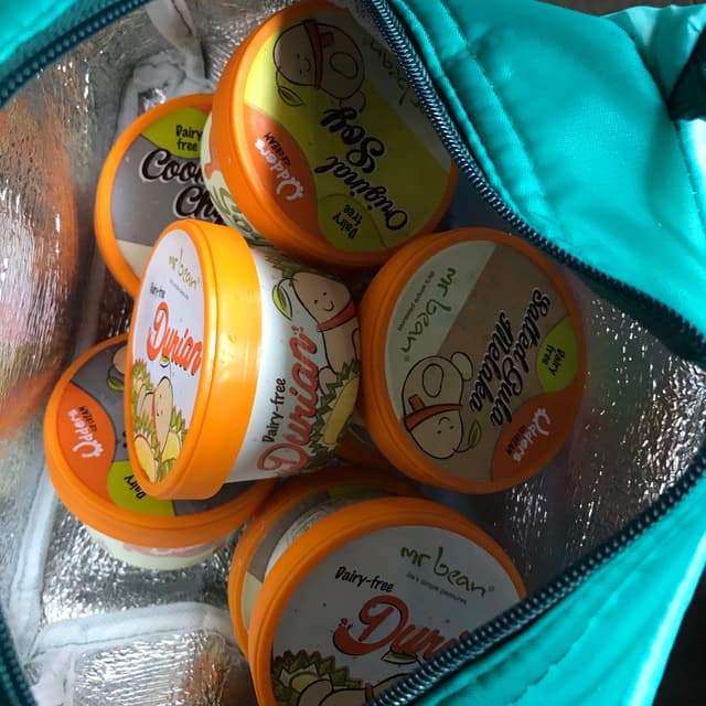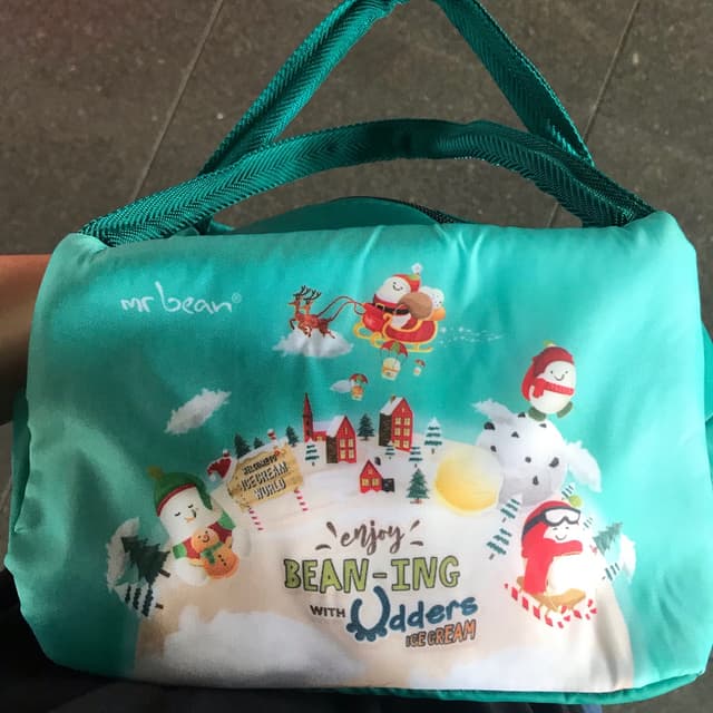 mr bean is so cute and is my fav soy milk stall! i bought 8 ice cream for $18 and they gave me a cooler bag (swipe left)! so cuteee w the xmas theme #veganin2020