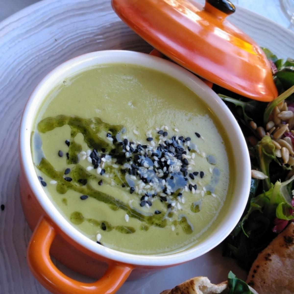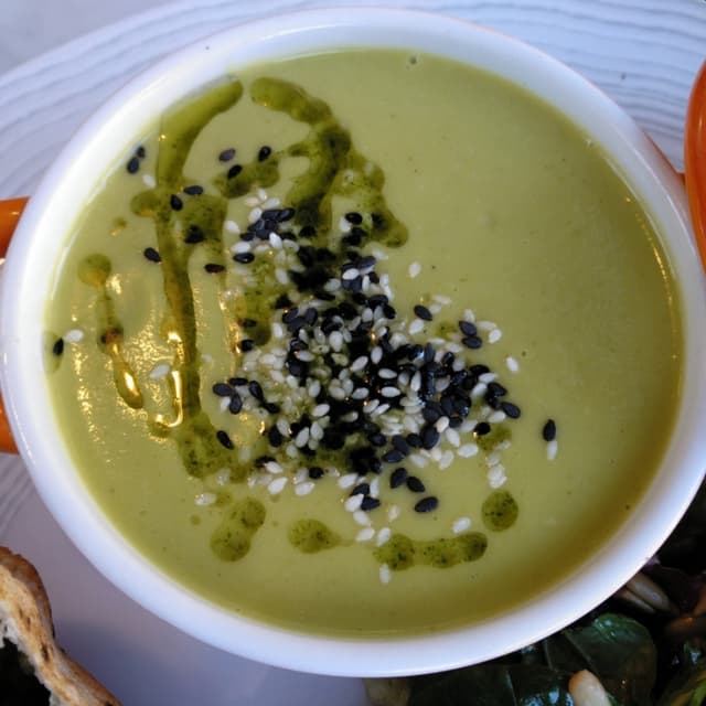 Exquisita! Con su topping de sésamo, una crema deliciosa como primer plato del menú.