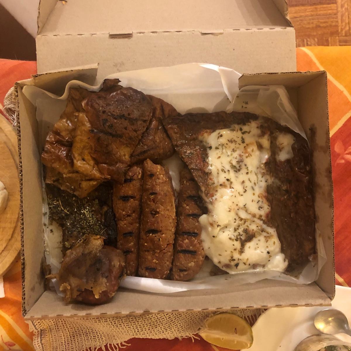 Parrilla para dos, trae: matambre a la pizza, 1/2 provoleta, 2 chorizo y seitan parrillero, viene acompañada de una guarnición (papas fritas o ensalada), una salsa a elección (criolla o chinichurri) y pan.