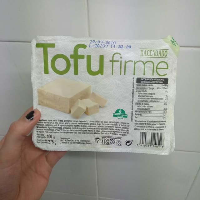 Comprado en Mercadona, es un bloque de tofu que ahora vale 2€ (antes 2'3€😘). Se puede congelar, de ahí el que caducase en septiembre del año pasado pero yo lo vaya a usar en febrero.