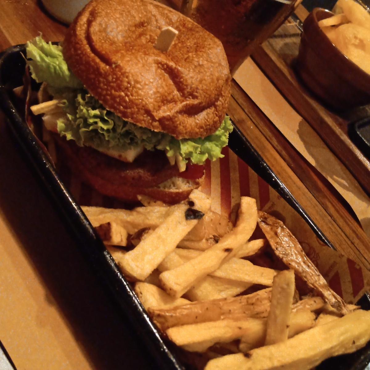 Hamburguesa doble not burger con queso de almendras tomates Cherry confitados, lechuga. Excelente servicio y muy accesible