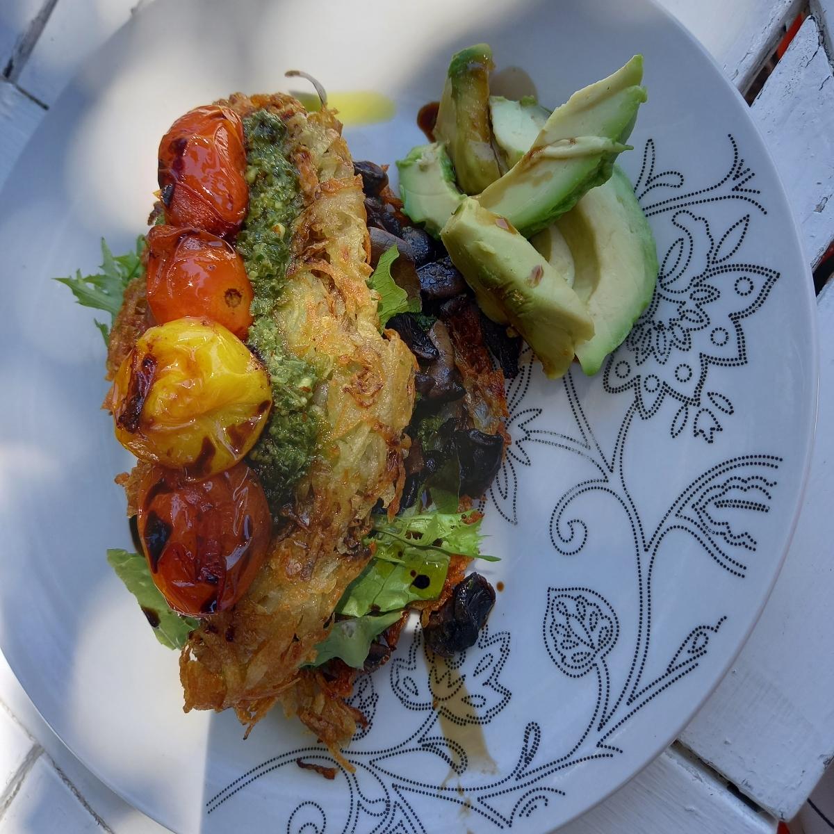 This is a rosti "sandwich" with a mushroom filling and tomatos and pesto on top. The avo is extra. Filled me up for the day!! #greytonfarmanimalsanctuary