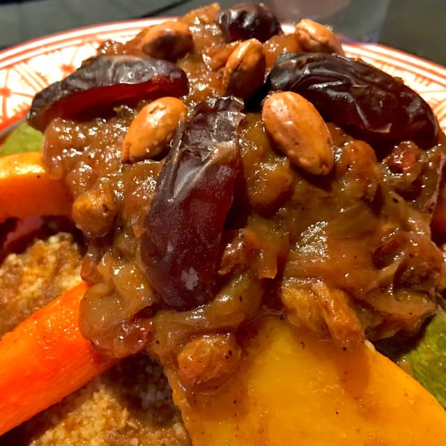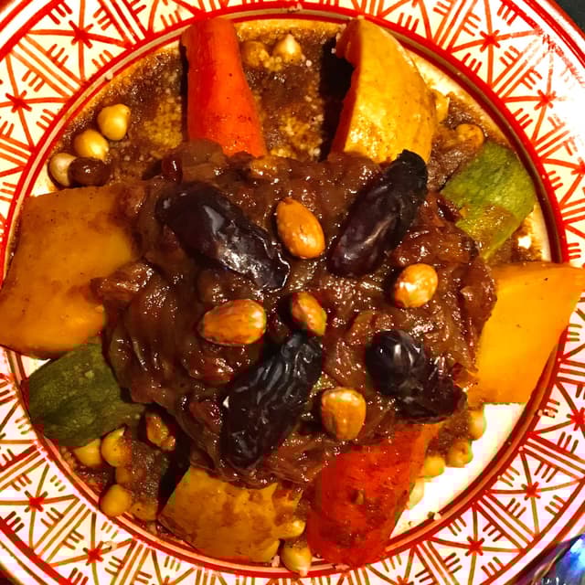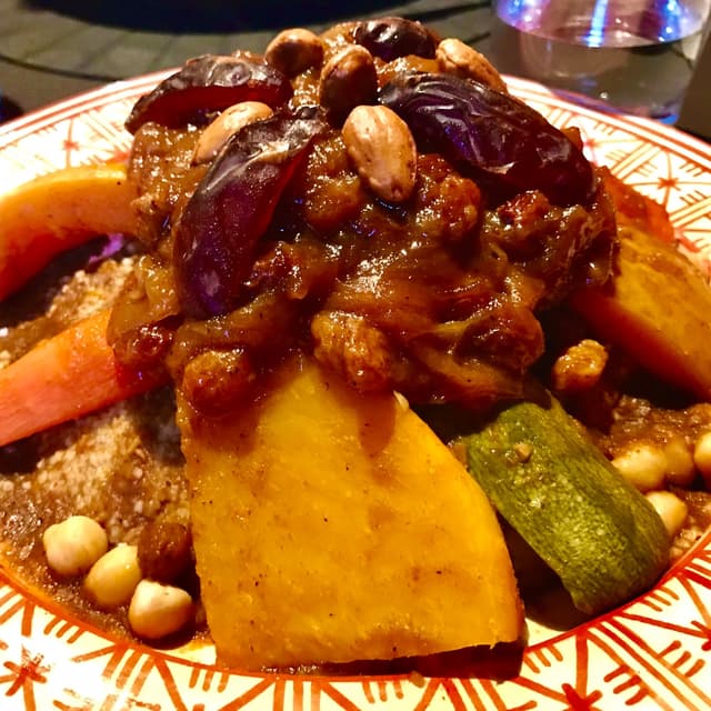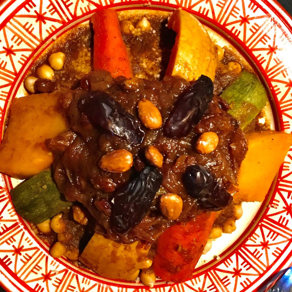 This was HUGE. There’s about half a squash, a whole carrot, a chunk of courgette, dates, a heap of caramélisés onions, a handful of raisins, almonds and chickpeas... and couscous underneath all of this!