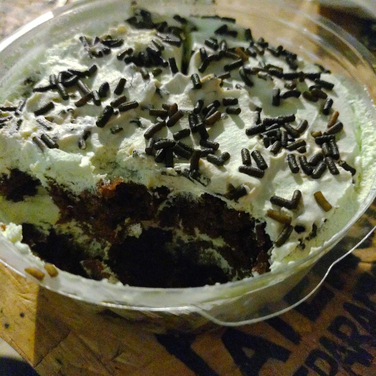 Brownie con crema americana, chispas de chocolate y corazón de frutos rojos. Muy rico, cero empalagoso, hecho por Diente de León pastelería. Excelente.