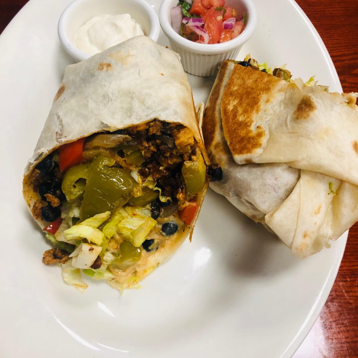 Seitan chorizo, black beans, sauteed peppers and onions, lettuce, sour cream, creamy queso.