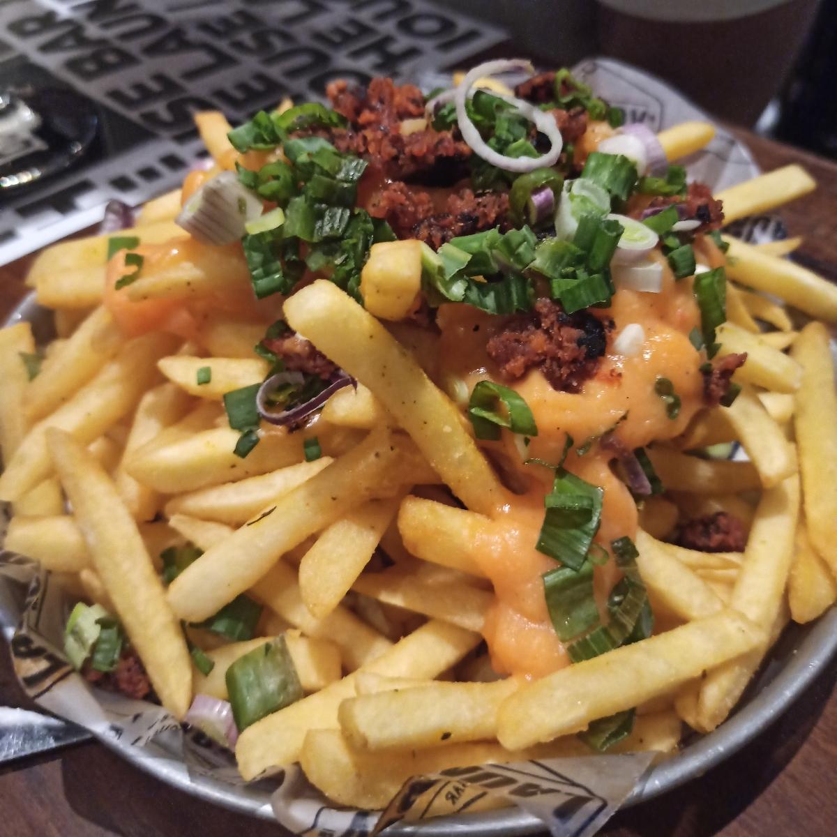Es el primer bar que encuentro que tienen opción de entrada de papas fritas copada. Viene con queso de papa, cebolla de verdeo y karnevil de felices las vacas, una genialidad.