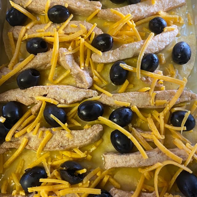 Great chicken strip alternatives. I love to make this into an enchilada casserole! I wish I had a cooked picture but they were eaten before I remembered to take a pic! I use medium green sauce, corn tortillas layer, more green sauce with chicken strips, daiya cheddar shreds, spinach, mushrooms, more green sauce, more corn tortillas and finish with green sauce! Bake at 350 degrees for an hour covered with foil! Super tasty!!!