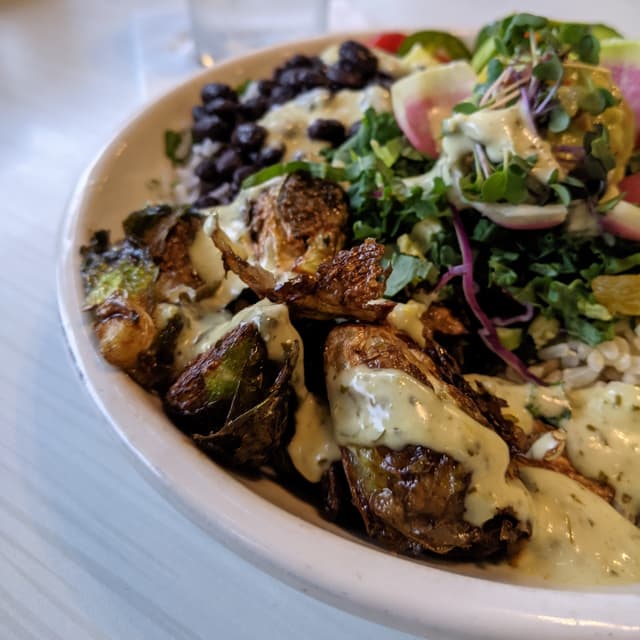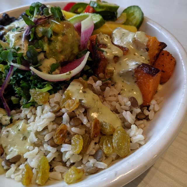 Organic lentil brown rice with golden raisins, ginger glazed brussels sprouts, herb basmati rice, Cuban black beans, pico de gallo, butternut squash, avocado relish, cumin cilantro and vegan aioli 🤤🤤🤤