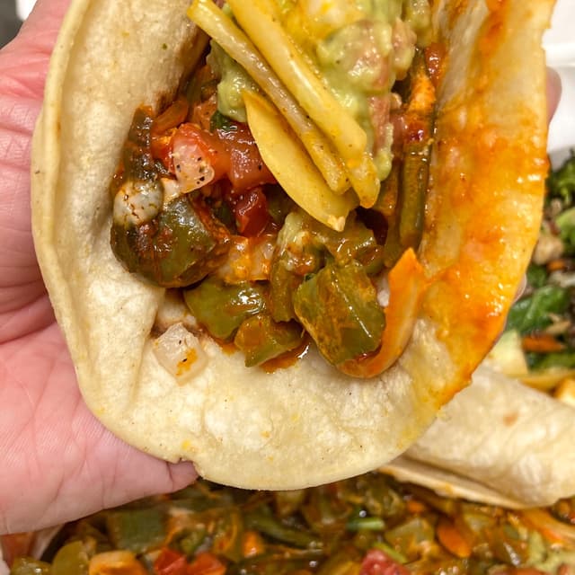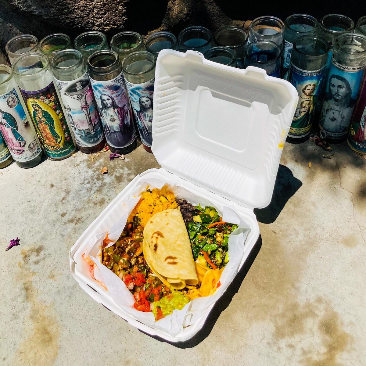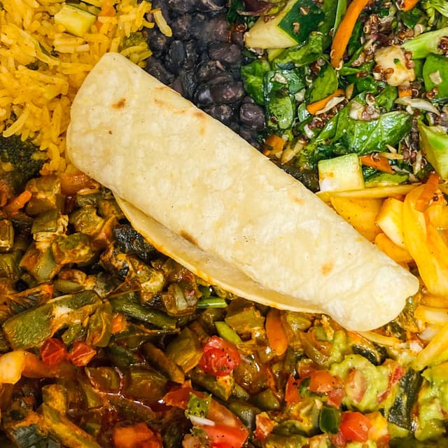 Amazing meal! (The same folks who run La Chaiteria.) Super healthy/quality ingredients prepared with love! Cactus-Onion-Red Chili Sauce-Poblanos-Tomatoes. Served with fresh tortillas, rice , beans, guacamole, salad and turmeric pickled onions. The red chili sauce has a nice dried red heat-just enough-Not set your mouth on fire hot. Lovely with the lemony nopalitos. The flavors are always well balanced-love that the veggies shine through. Always a feast! Very generous portions. #abillionturns3