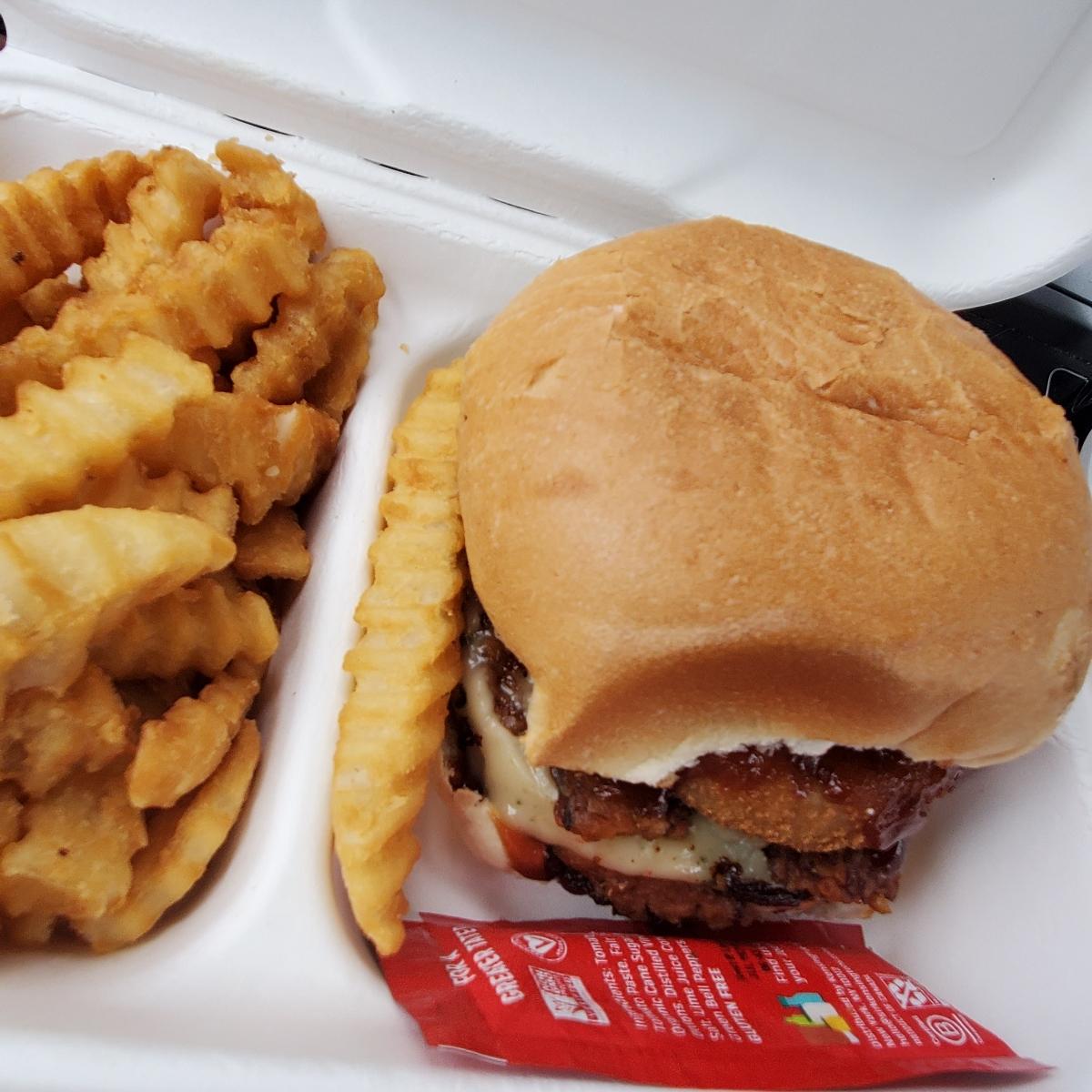Hits the spot every time Beyond Burger patty Pepper jack vegan cheese Vegan onion ring