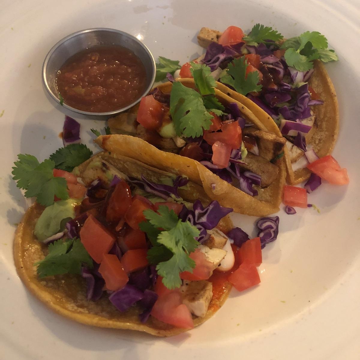 Grilled tofu with cabbage and spicy sauce on corn tortillas. Served with salsa