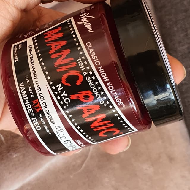Tinte semipermanente "vampire red" (rojo). Manic Panic no testa con animales y es vegano.