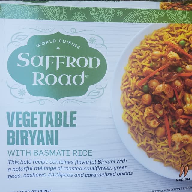 The best vegan frozen microwave meal imo. They are almost always out of stock but when we see them we grab them all. The basmati rice is soft and delicious and this has all the veggies I love- onions, cauliflour, peas, chickpeas. Mmmm.