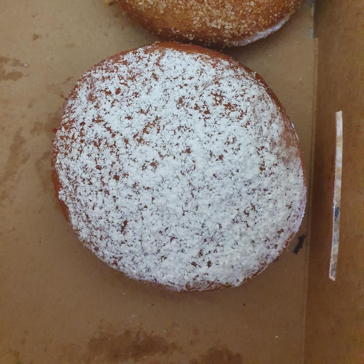 Amazing jelly-filled donut with powdered sugar. What more could you ask for ? What a delight!