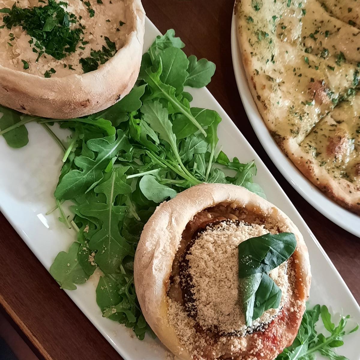 These were little pizza pies, the pizza dough was shaped into a bowl and filled with sauce and toppings. The one on the right is aubergine parmigiana and the white one on the left is four cheese.
