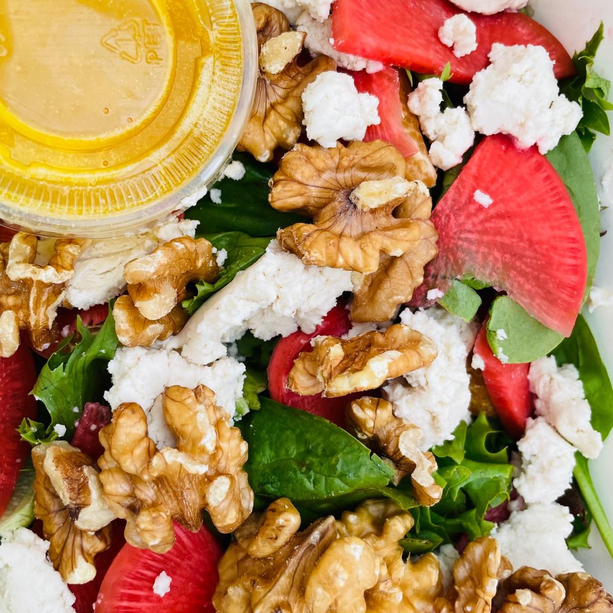 Seasonal surprise! Perfect homemade vegan cheese, fresh salad greens, mandarin oranges 🍊, walnuts, and pickled watermelon radish. Finished with a bright citrus dressing!