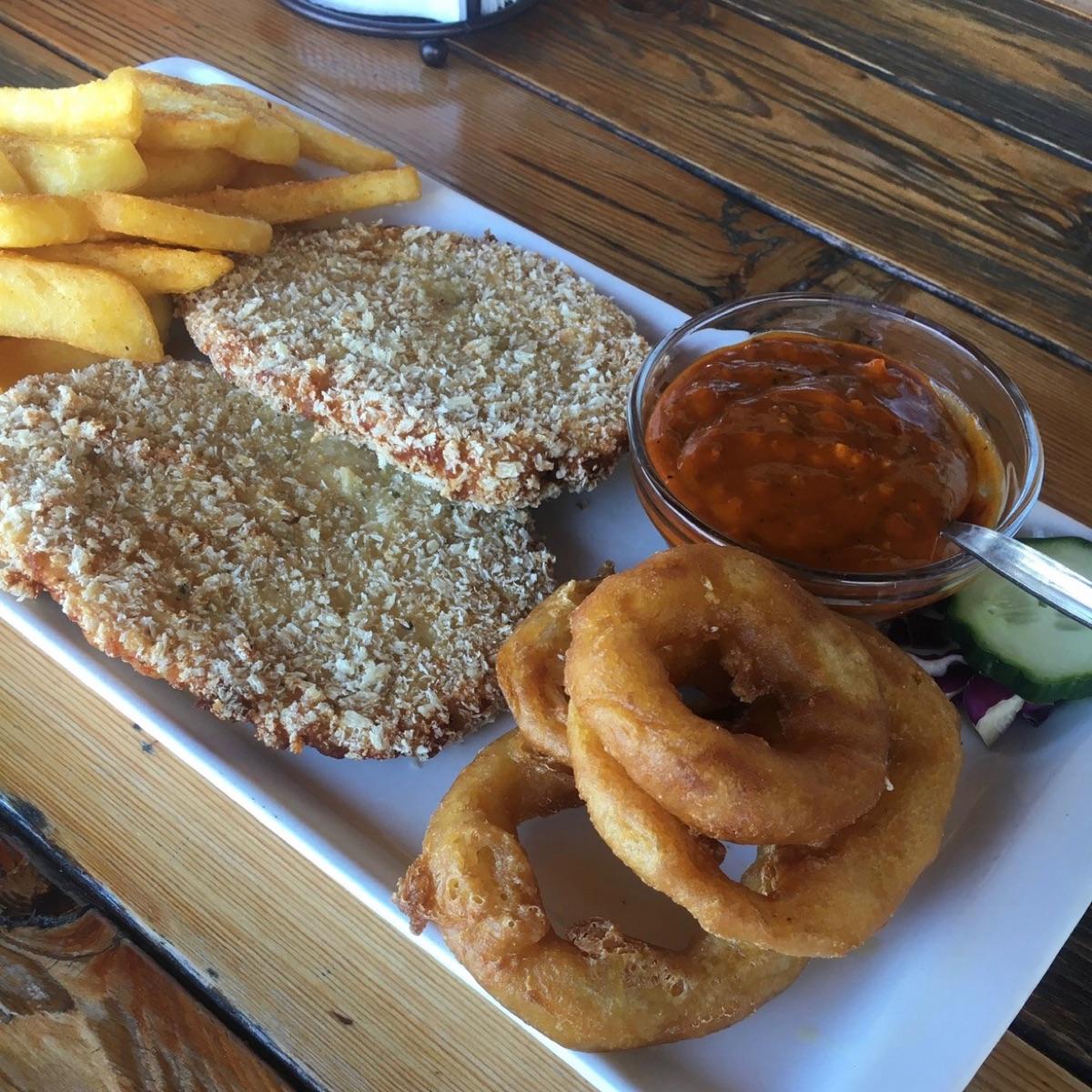 Vegan schnitzel with smoky vegan mayo, served with a side of chips and onion rings (I think you can choose veggies or salad as a side instead). Delicious and super filling. 🌱
