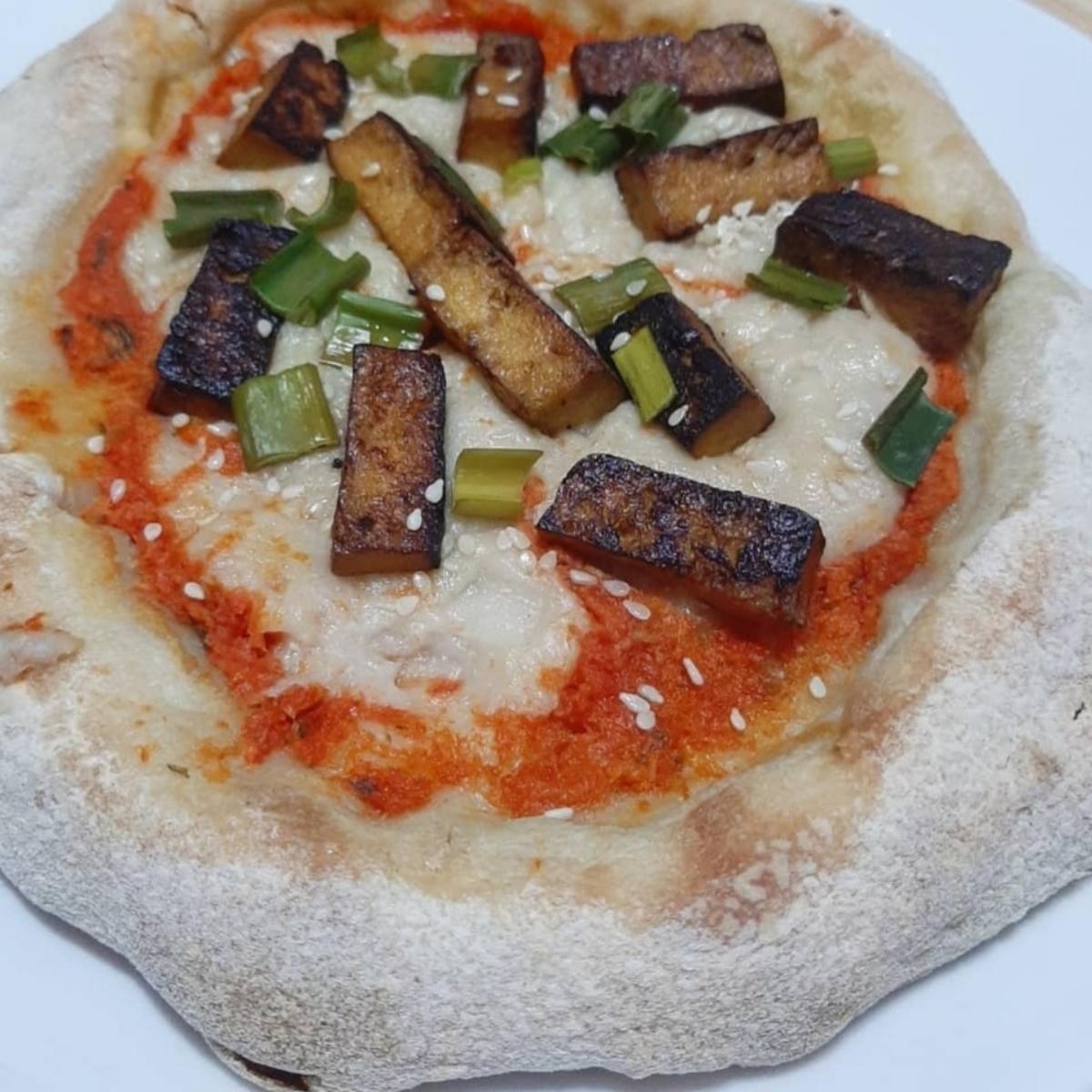 Pizza individual con queso muzzarella, tofu oriental y verdeo.