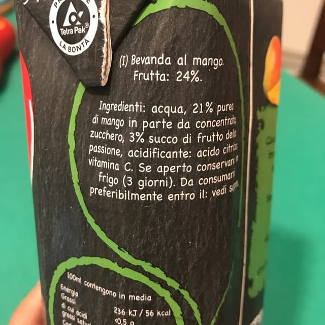 Succo molto buono e diverso dagli altri. Ho solo una cosa da ridire, dovrebbero scriverci vicino a mango anche frutto della passione perché, è vero che ce ne sta solo il 3%, ma è comunque presente e si sente