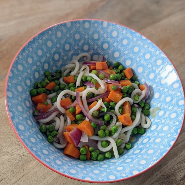 Nouilles précuites. Le truc est de saisir des légumes dans un wok (sauteuse ou grande poêle fait l'affaire) puis d'ajouter du bouillon chaud et les nouilles, assaisonner à son goût. C'est prêt ! Assez réussi avec carottes, oignon et petits pois, sauce soja et huile de sésame.