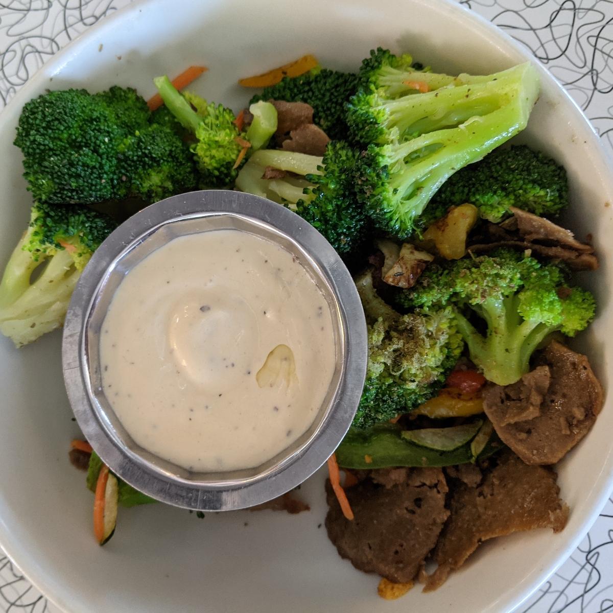 The healthiest but still savory and delicious option on there menu. There broccoli is cooked to perfection. You choose the "protein" and sauce, I picked seitan and the Caesar dressing.