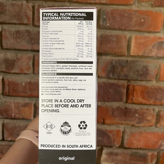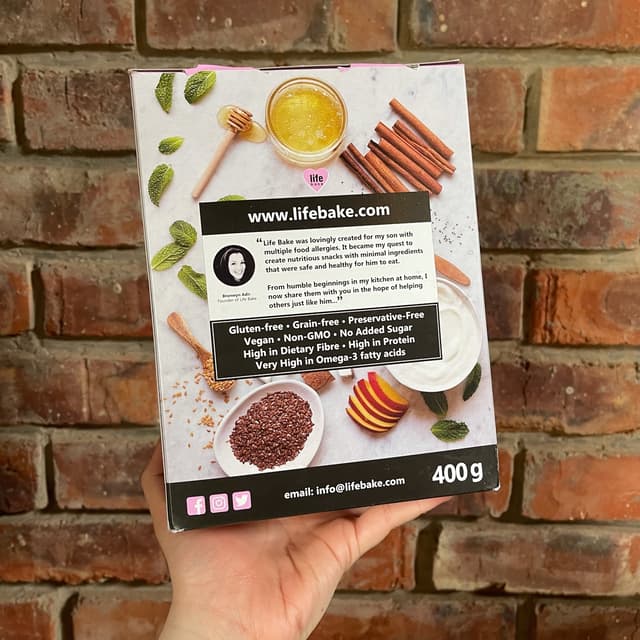 Fantastic product from Life Bake 🙌🏻 I love this grain-free granola. The box contains 10 single serve individually-wrapped packets. Each serving contains 8.3g of protein, 1g of carbs and a whopping 10g of fibre. The ingredient list is also super clean 🤩🤩 #veganisnotscary (3/90)
